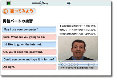 | 豊富な音声に加え、動画を見ながらその場面の生きた会話に触れることができ、 生の英語を実体験することができます。 |