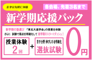 勝平会場 個別指導 所属本部 秋田本部 トピックスTopics 2026.04.06 【個別指導】新学期スタート! 2026.04.06 【個別指導】2回の授業体験 2026.04.06 【速読】国語力アップや英語長文読解対策に最適! 教室データ 住所 秋田県秋田市新屋朝日町14-3 電話番号 018-863-1555 受付時間 13:00~21:00 勝平会場への資料請求・お問い合わせ・授業体験