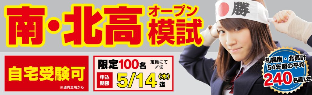 【札幌 中1~中3】南・北高オープン模試 2026.04.03 【南・北高オープン模試】 実施日:5月17日(日) 学年:中1~中3 教科:国数英 ※中1は国数の2科目 ※本テストは自宅受験も可能です。詳細はお問い合わせください。 実施要綱はこちら 資料請求・お問い合わせ・授業体験