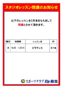 休館日に伴いスタジオレッスン閉講のお知らせ