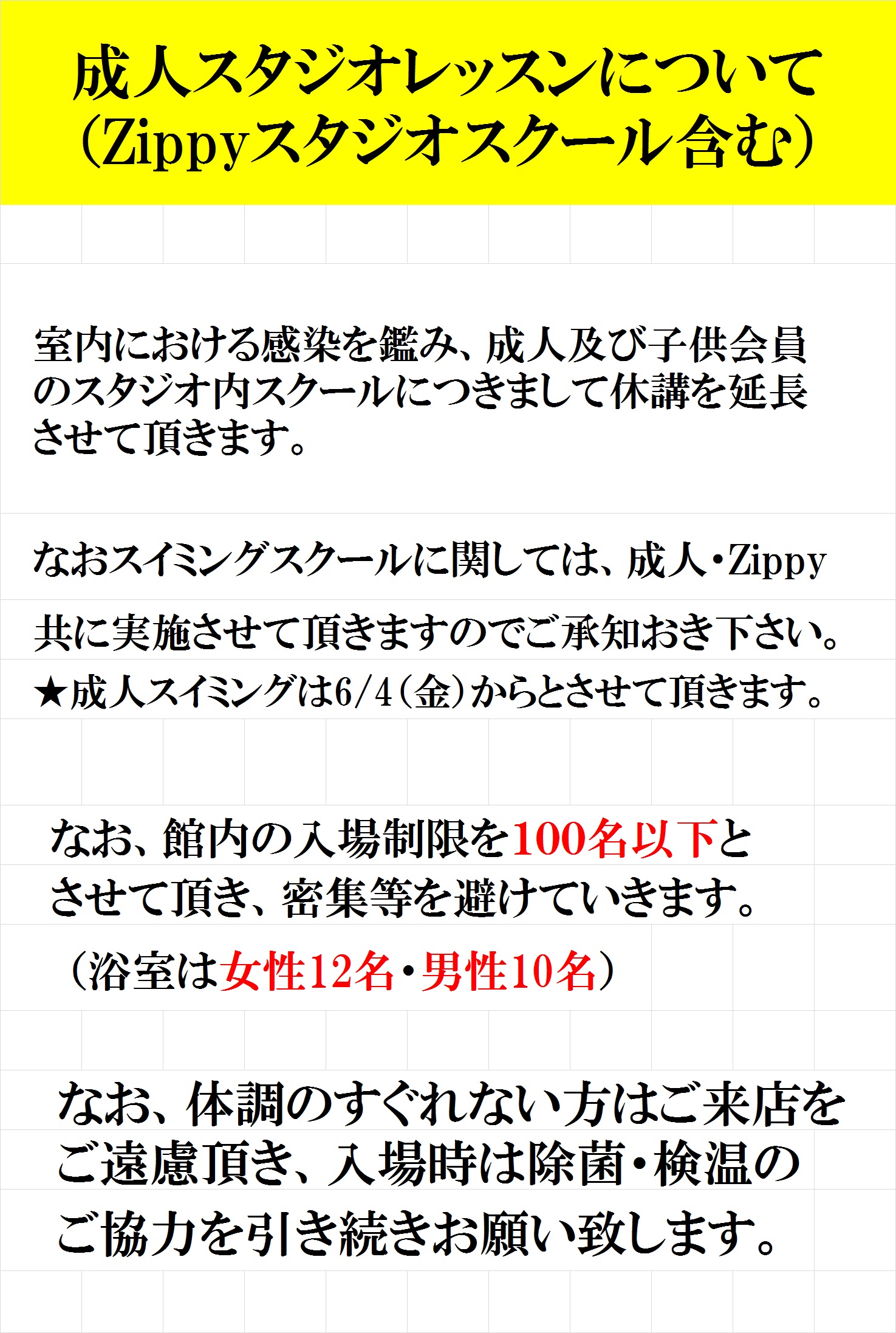 会員の皆様には、スイミングスクールのみ再開させて頂くとともに、引き続き館内及び浴室の人数制限,スタジオレッスンの休止などでご理解とご協力を頂けますようお願い申し上げます。